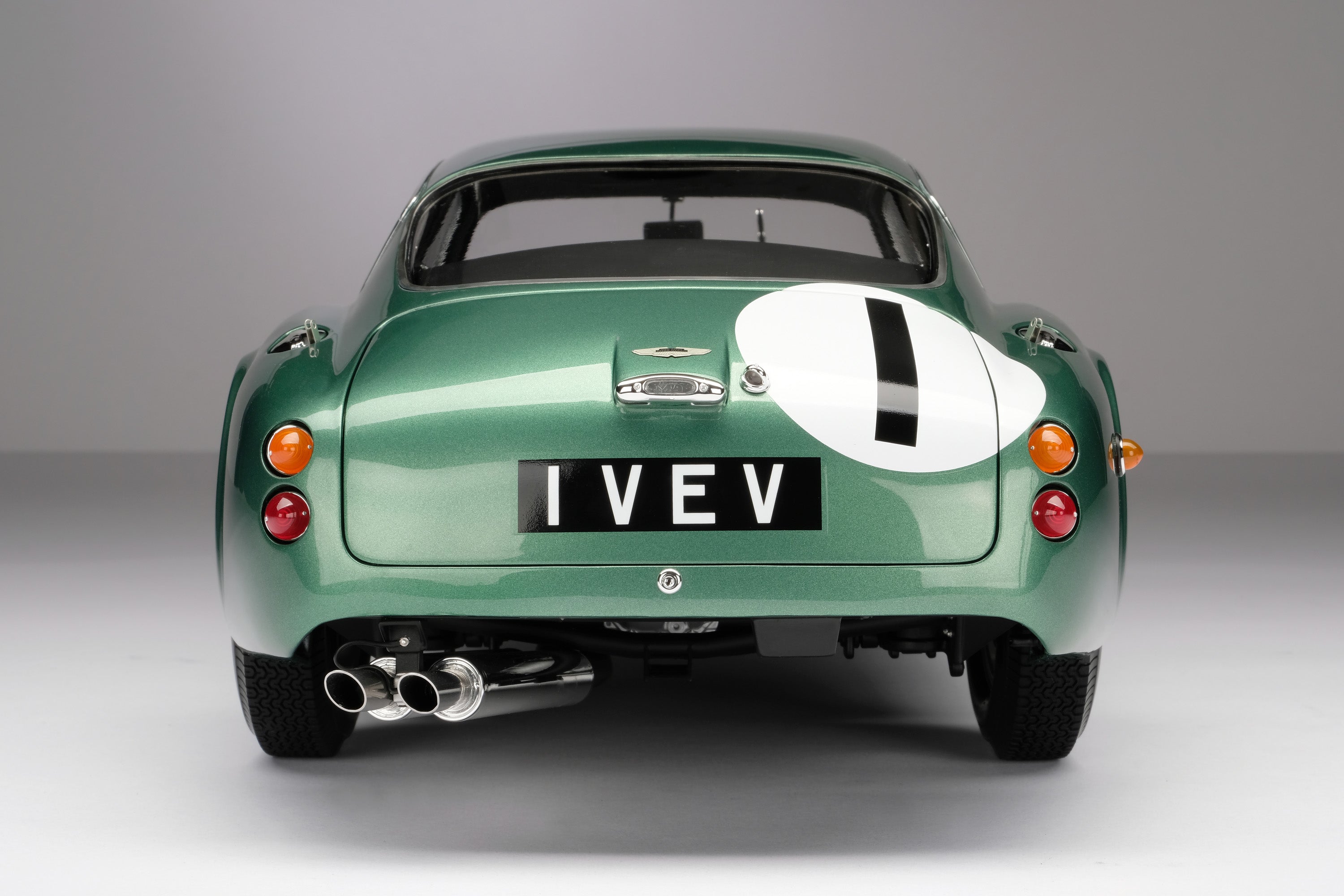 This fine 1:8 scale model of the Aston Martin DB4 GT Zagato replicates chassis DB4GT/1082/R, more commonly known as ‘1 VEV’, exactly as raced at the 1961 RAC Goodwood Tourist Trophy in the hands of Roy Salvadori for John Ogier’s Essex Race Stable. Arguably one of the car’s finest moments, Salvadori qualified third fastest after practice with a time of 1 minute 36.6 seconds, ahead of his teammates Jim Clark and Innes Ireland, but behind Stirling Moss and Mike Parkes in their Ferrari 250 GT SWBs. A slightly slower start dropped 1 VEV to fourth behind Clark at the end of the first lap, though Salvadori regained this place soon after as the trunk of Clark’s Aston had opened itself and had to pull into the pits to fix the issue. Around halfway through the race, Parkes was black-flagged when part of his undertray began to drag on the road after an off-course excursion behind the bushes at Woodcote, allowing Salvadori and 1 VEV up into second place. This was not to last, as Parkes made a tactical surprise on his fourth and final pit stop, managing to undercut both Salvadori and Ireland to regain second place. Although Salvadori tried hard in the last 15 minutes to pull back the seven second deficit, the heavier Aston Martin just did not have the steam to make up any ground and he brought the car home to claim the final podium position.