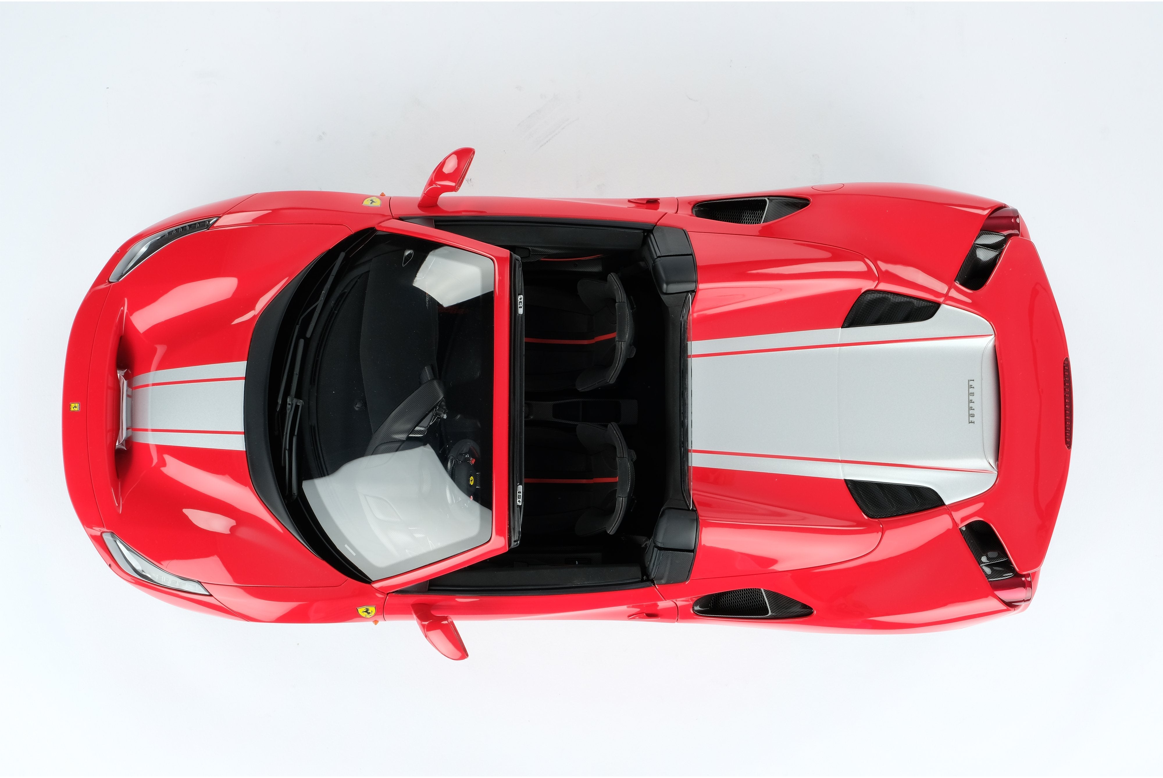 This fine 1:8 scale model of the Ferrari 488 PISTA SPIDER has been handcrafted and finished in our workshops with the co-operation and assistance of Ferrari regarding original finishes, materials, archive imagery and drawings. The use of supremely accurate digital scanning of the original car has allowed us to perfectly recreate every detail at scale. Furthermore, it has undergone detailed scrutiny by both engineering and design teams to ensure complete accuracy of representation.