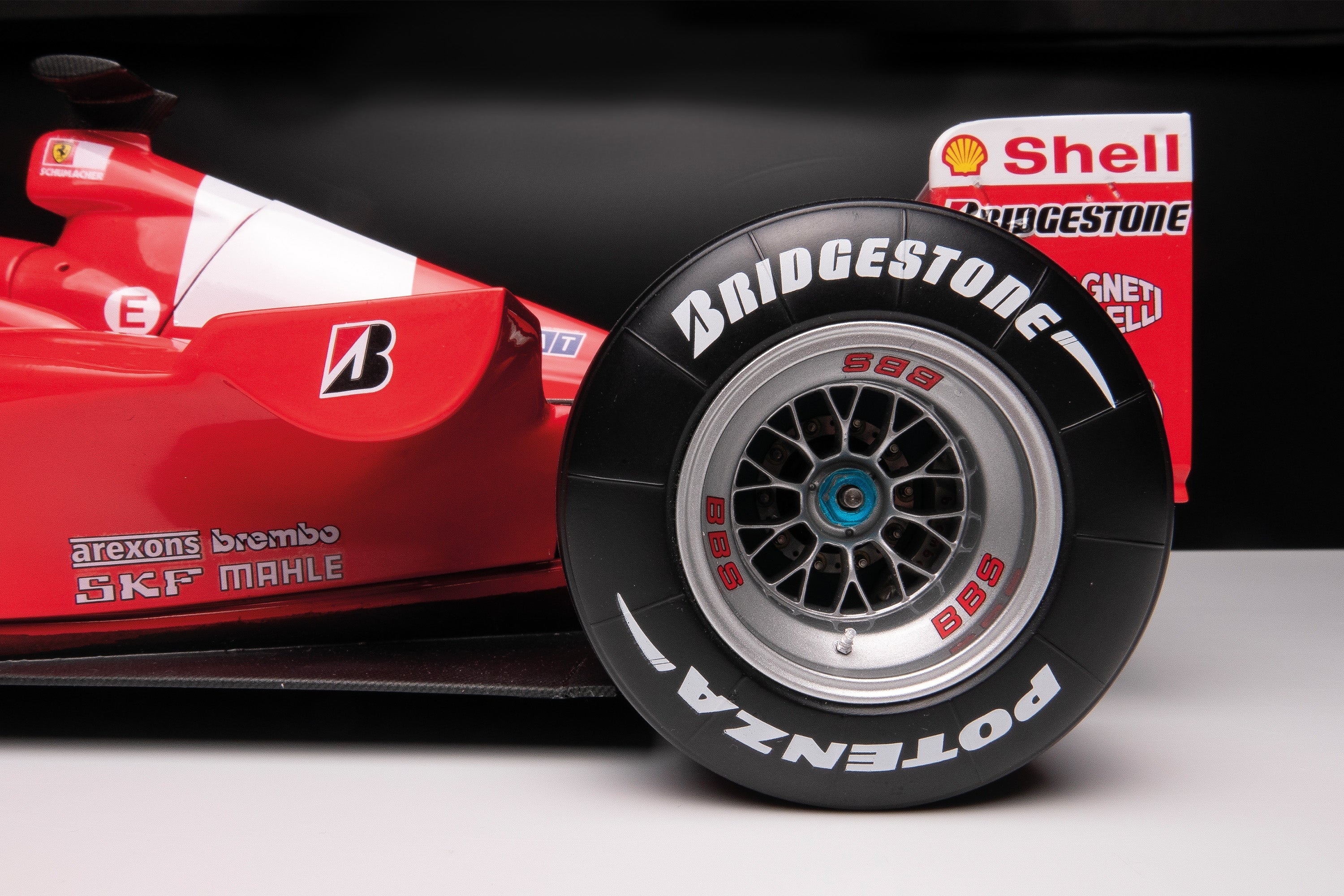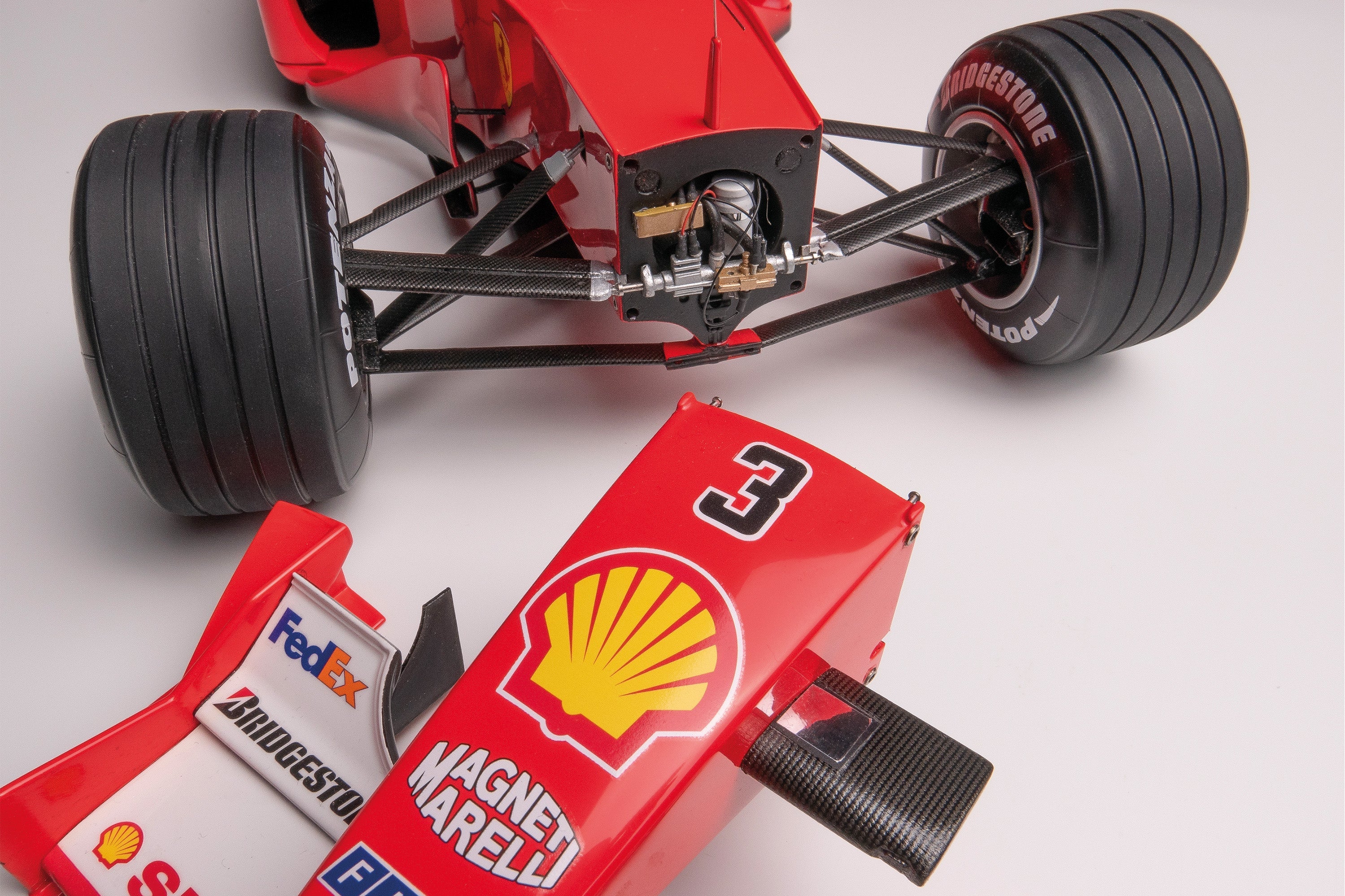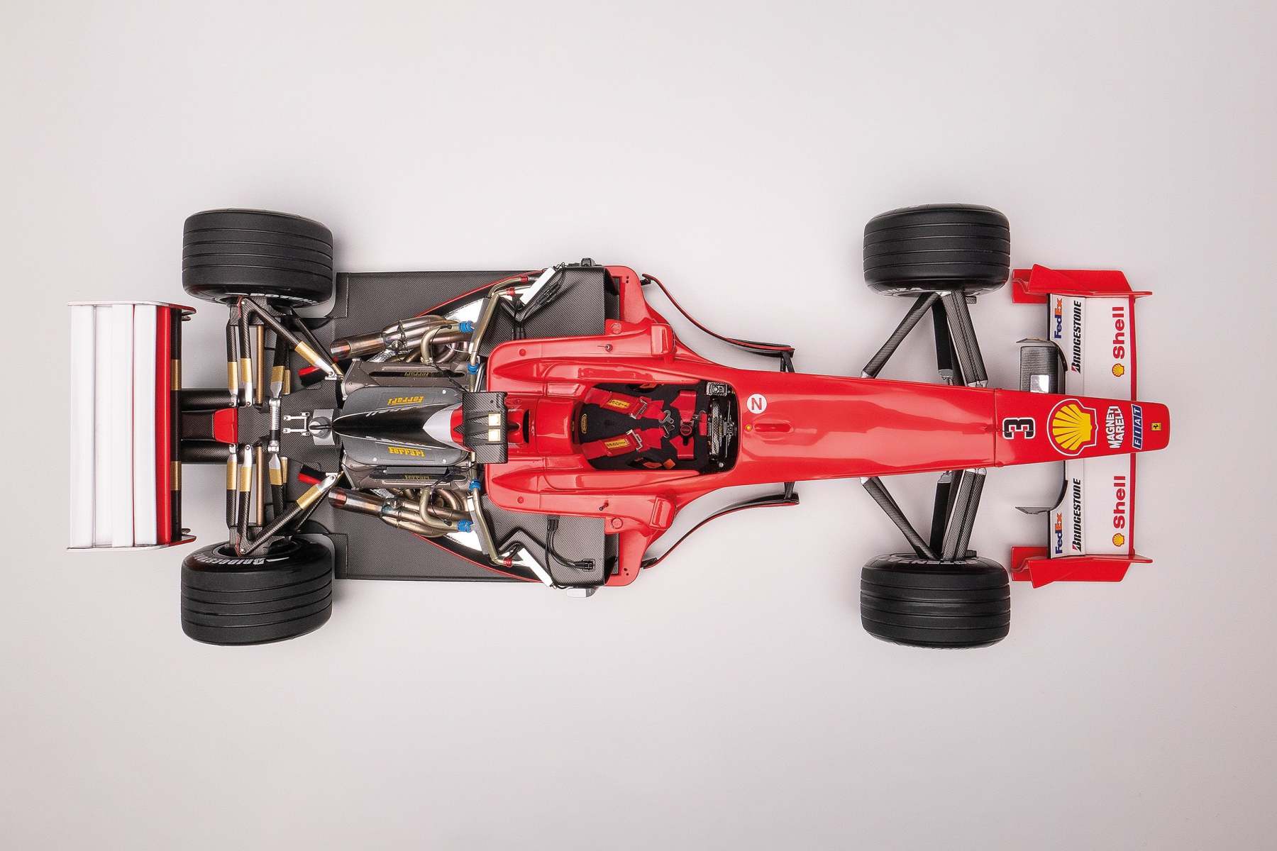 Each fine 1:8 scale ‘Super Detailed’ model of the Ferrari F1-2000 has been methodically restored to its original condition, as first delivered to Ferrari in 2001, by our small team of artisans in Bristol. The model’s nosecone is removeable and the the engine cover is made of genuine carbon fibre and can be removed to reveal the detailed 049 engine and gearbox within. This edition is a genuine period piece, beautifully crafted by Amalgam’s team of craftspeople over 20 years ago.