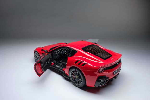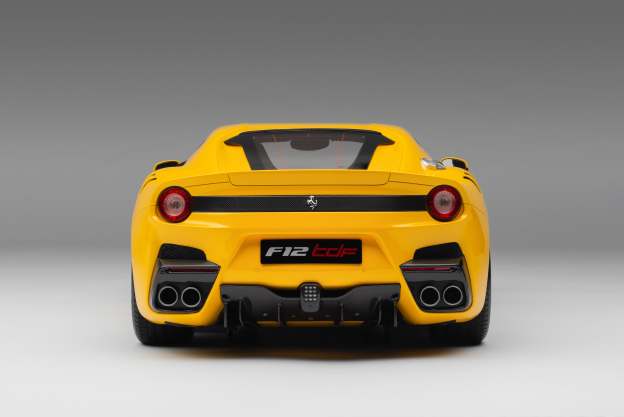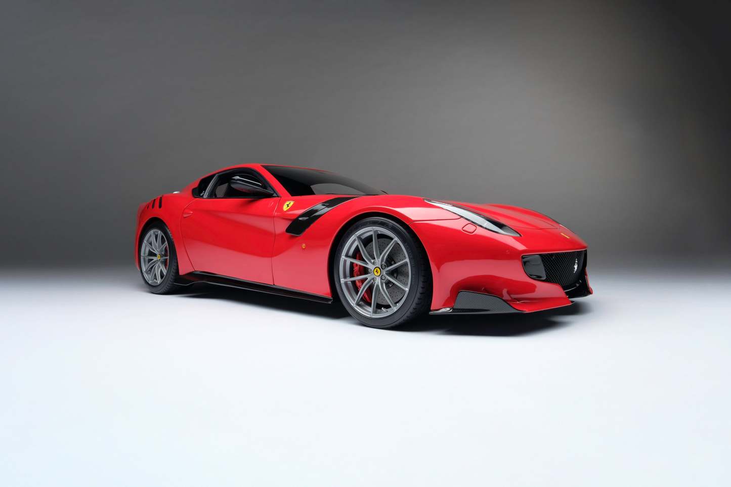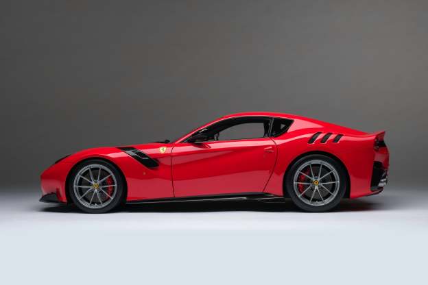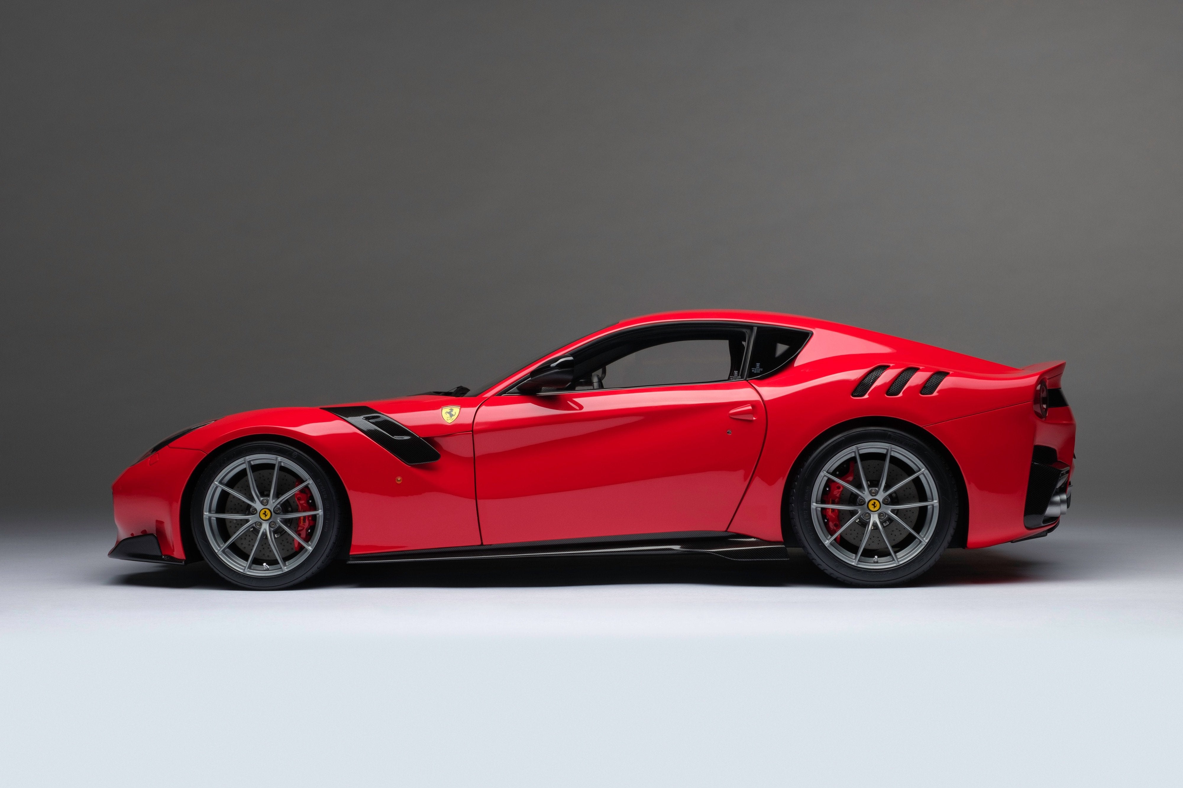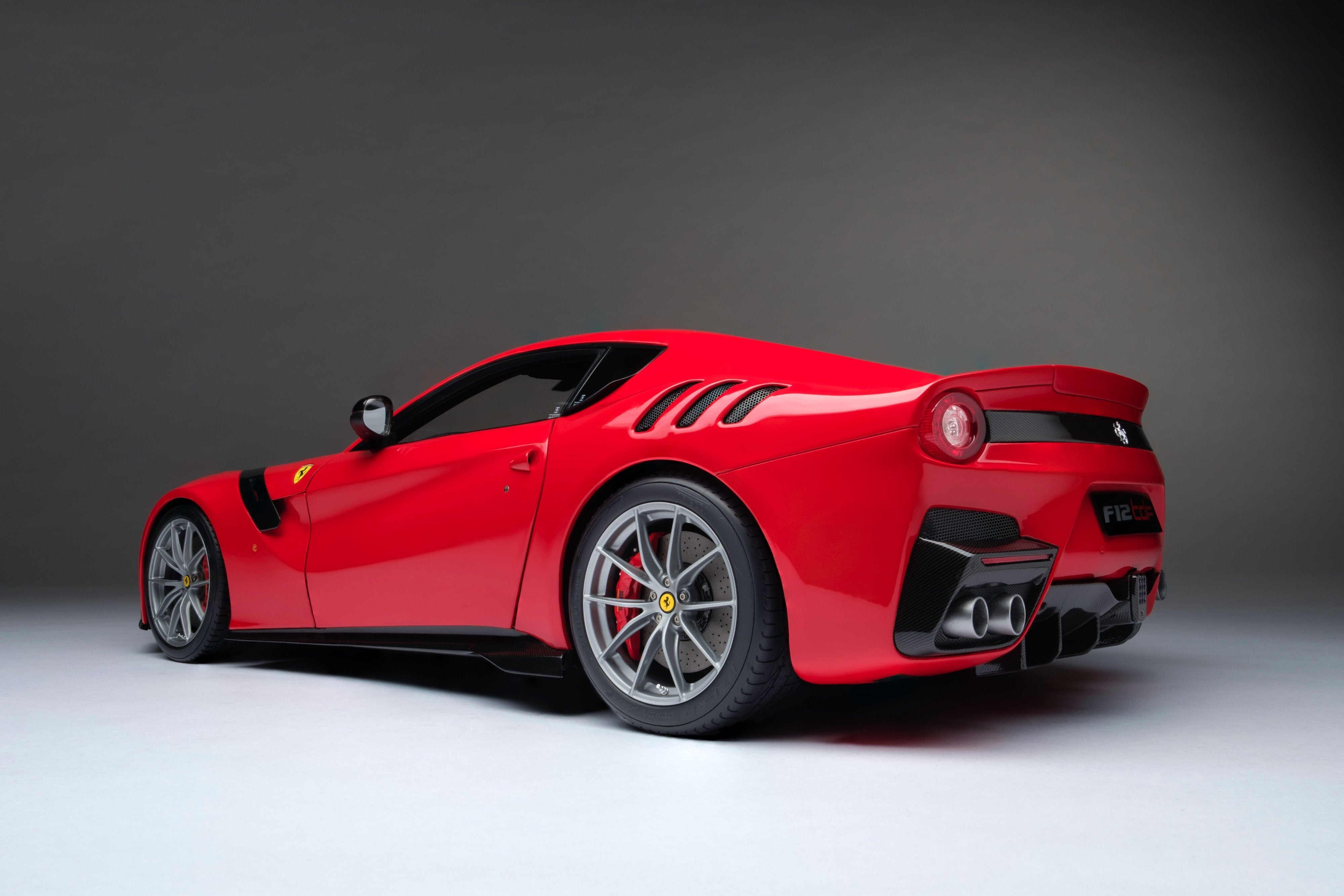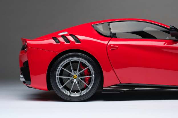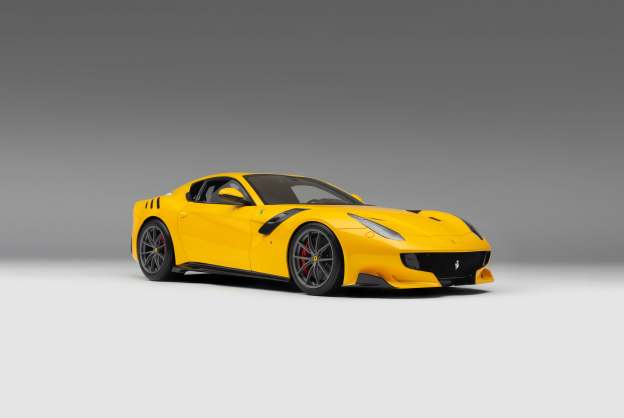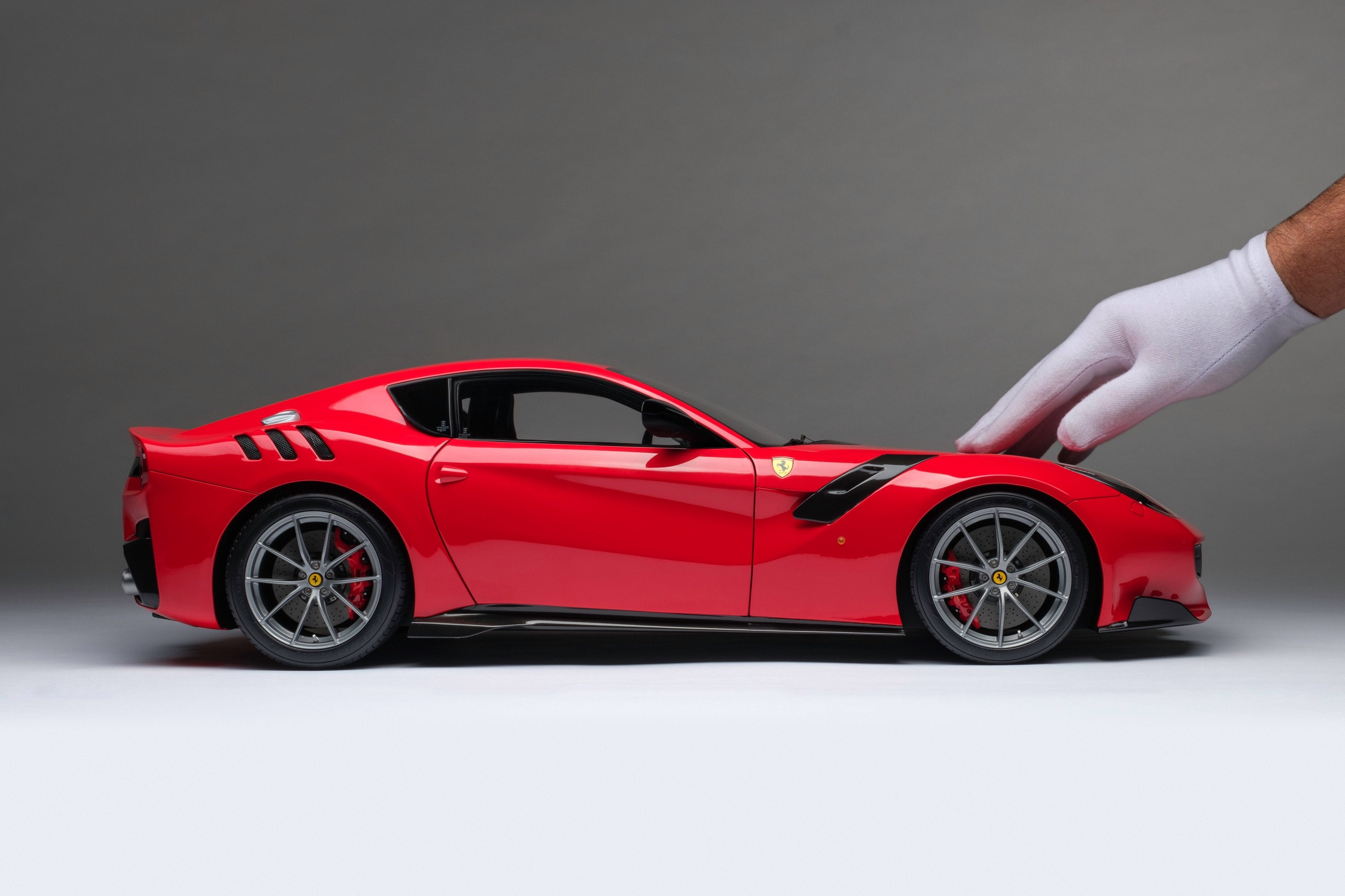 The F12TDF represented an updated and reengineered version of Ferrari’s F12 naturally aspirated V12 supercar. The TDF is the ultimate expression of the concept of an extreme road car that is equally at home on both road and track. This model, which is available in either a Rosso Fuoco (as shown) or Giallo Modena version, has been handcrafted utilising the original CAD data supplied directly by Ferrari. It has undergone strict scrutiny by both the design and engineering teams to ensure complete accuracy.