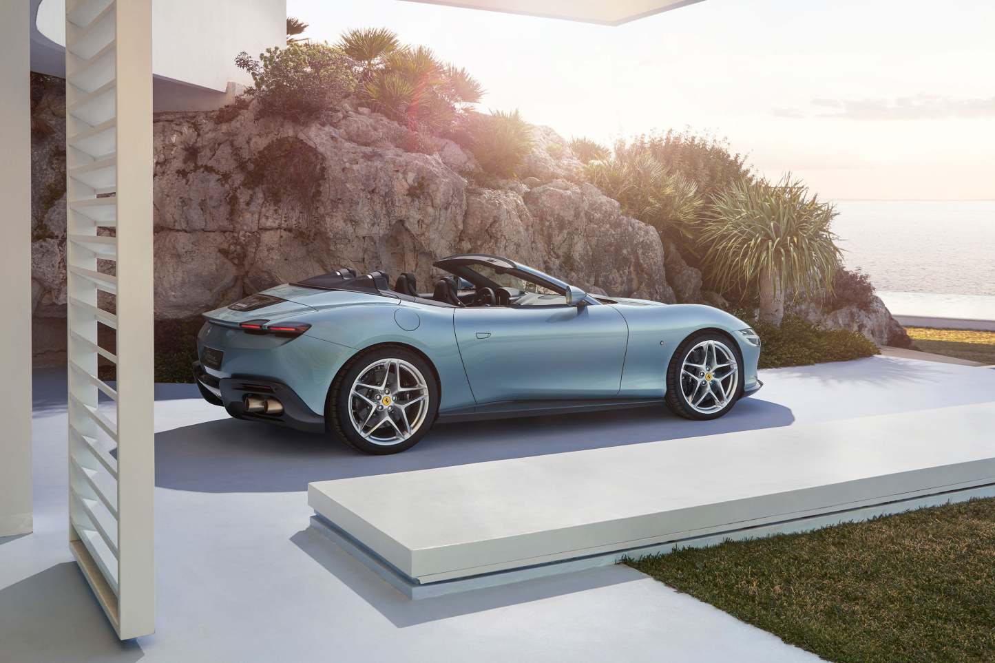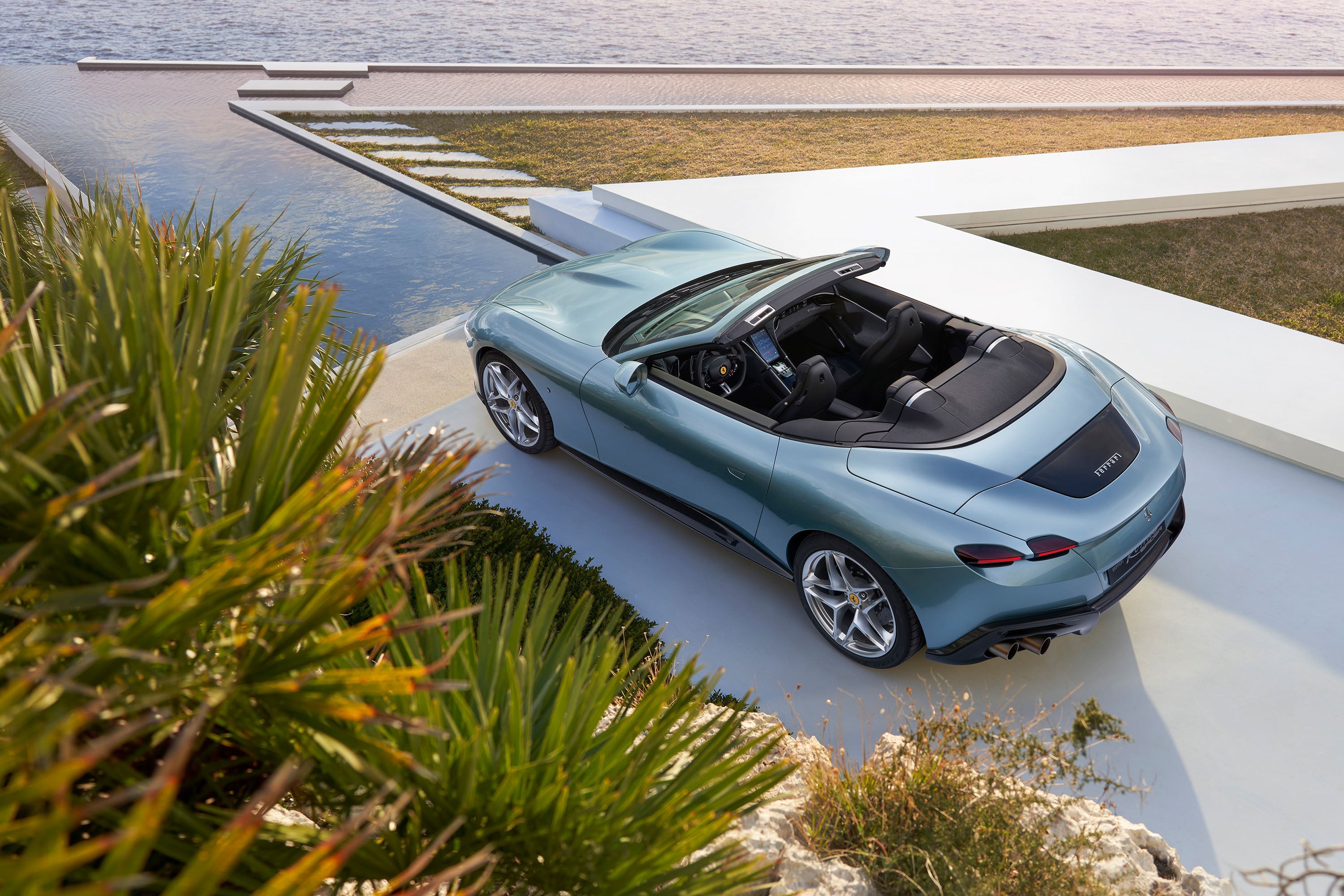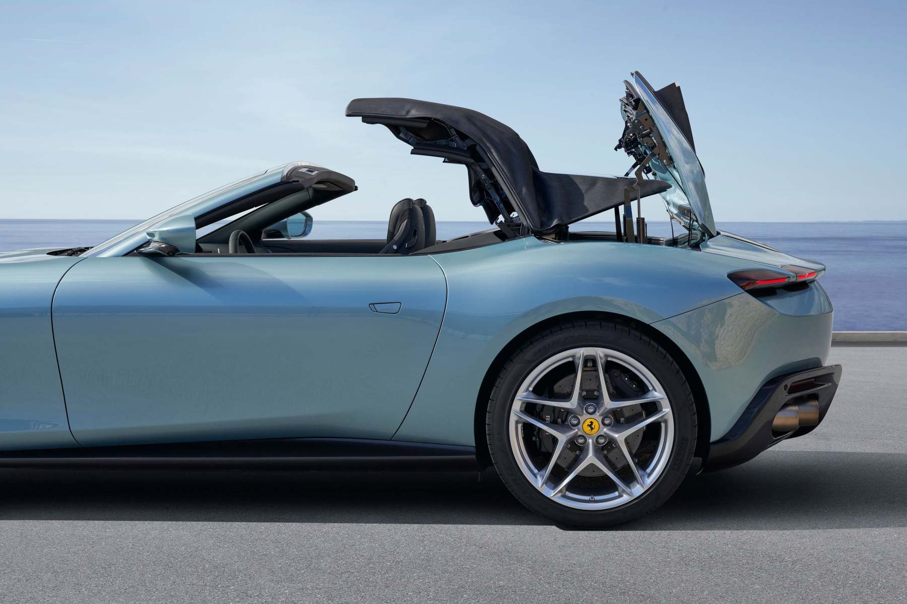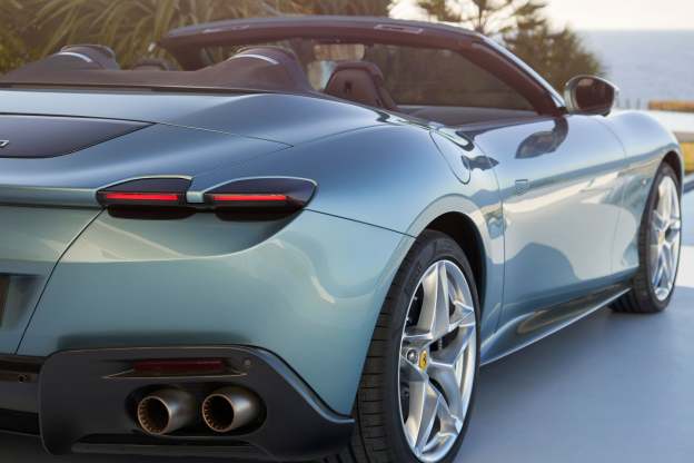 Contrasting typical Ferrari sports cars, which tend to build around the figure of the driver, the Ferrari Roma Spider’s cockpit takes on an almost symmetrical structure, with the creation of the Dual Cockpit concept. This has created an organic distribution of space and the car’s functions within the cockpit allowing the passenger to feel integral to the driving. A dedicated interactive display has been added to the passenger side of the car, allowing the passenger to transform into the co-driver. The Roma Spider’s exterior focuses on a clean design, ensuring a smooth flow between its various elements with balanced proportions and elegant dimensions. To further highlight the car’s minimalistic design, all unnecessary detailing has been removed, allowing the illusion that the car was sculpted from a single block of metal.
