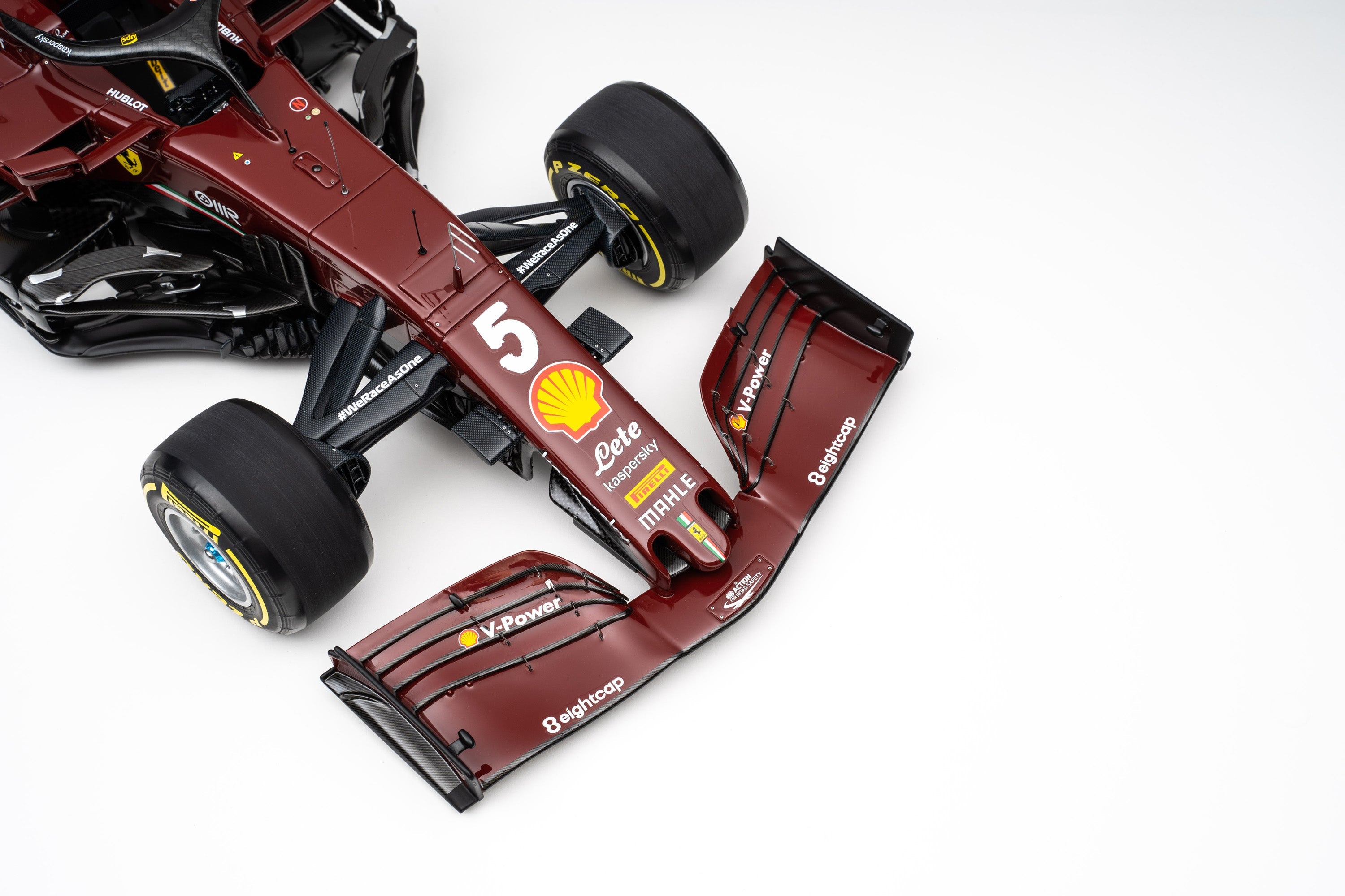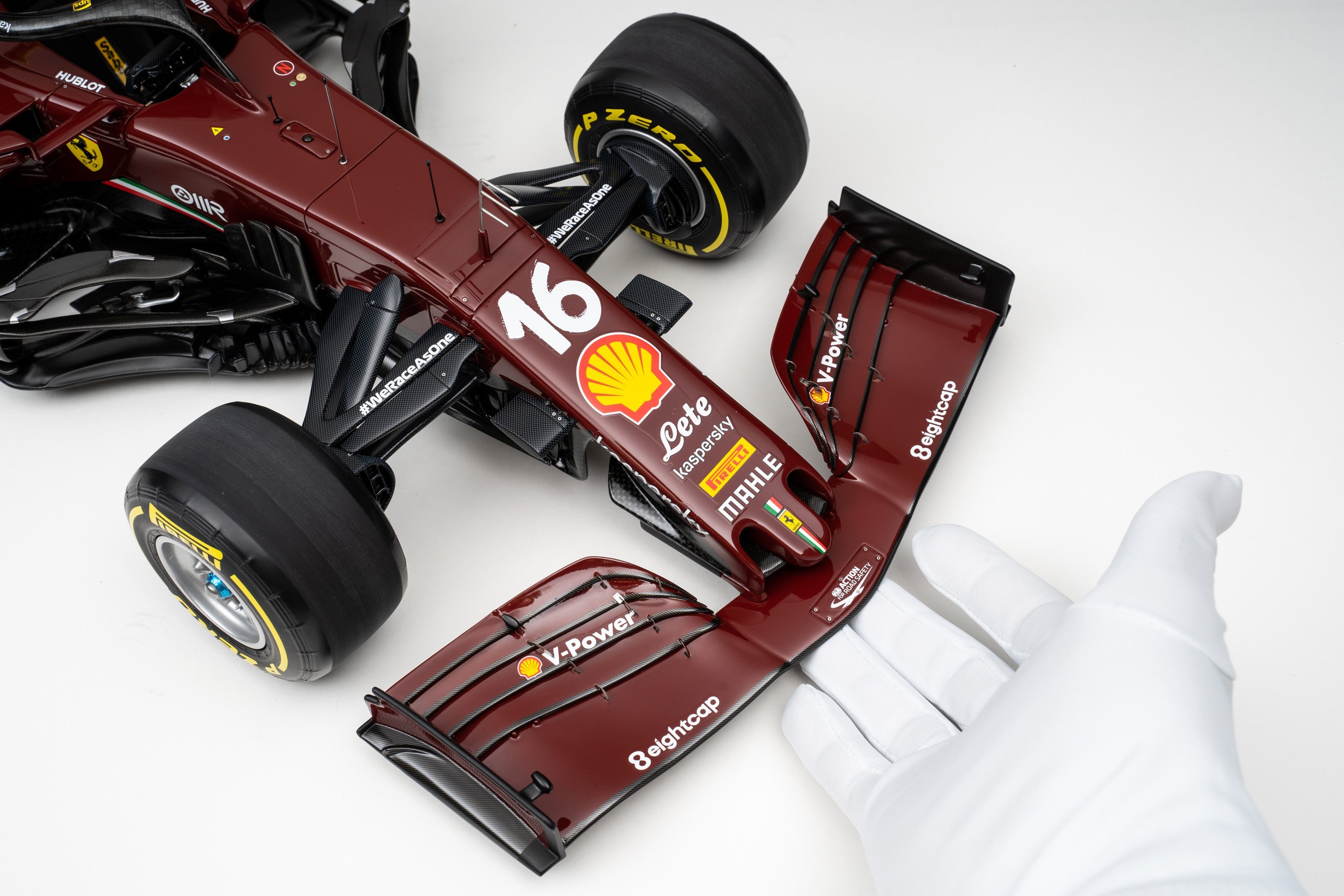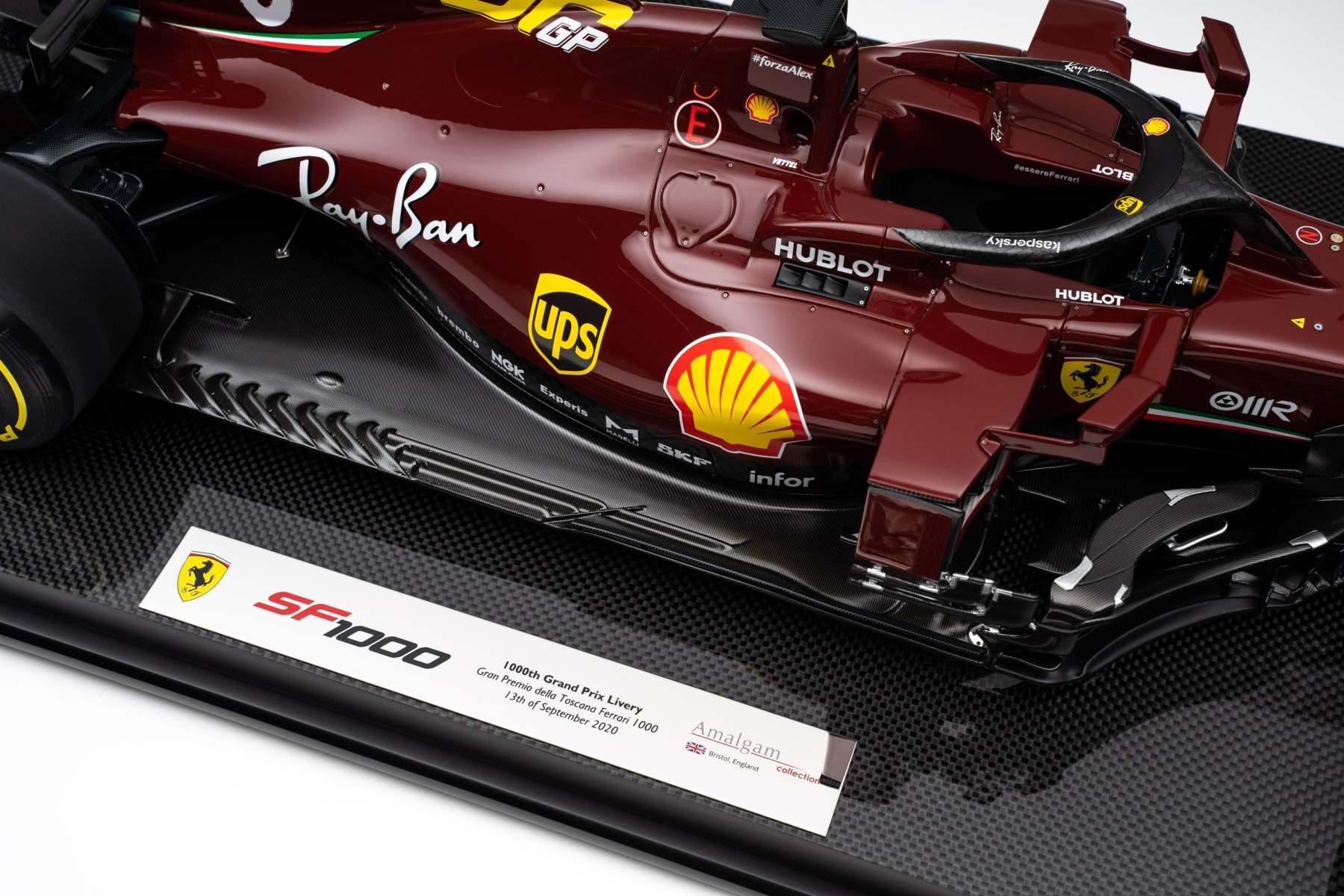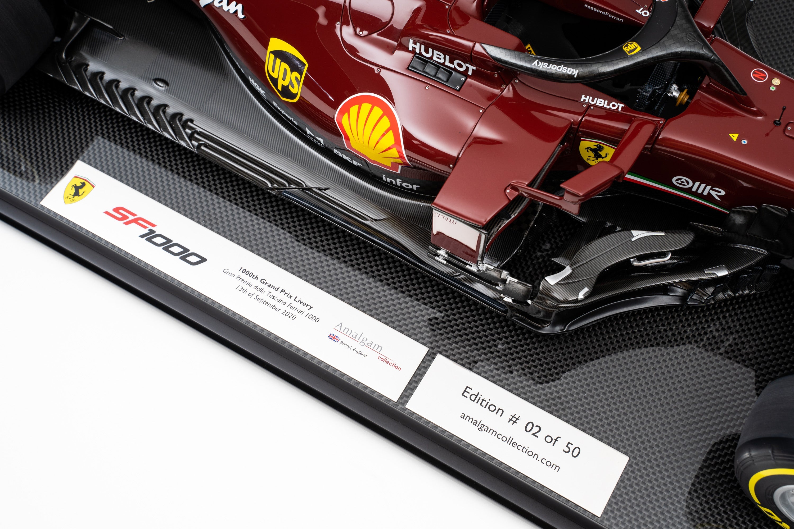 This fine 1:8 scale model depicts the Ferrari SF1000 exactly as raced at the Gran Premio della Toscana Ferrari 1000 at the Prancing Horse’s own Mugello Circuit on the 13th of September 2020. It perfectly replicates the car’s unique, celebratory 1000th Grand Prix livery. The burgundy colour paid tribute to Ferrari’s origins and harks back to the colour of the 125 S, the first racing car to carry the Ferrari name. The look of the race numbers reflected the tradition of the past, giving the impression of being hand painted onto the bodywork, while the drivers’ race suits matched the car colour. It has been handcrafted and finished in our workshops with the co-operation and assistance of Scuderia Ferrari regarding original CAD data and detailed colour and material specifications. Furthermore, it has undergone detailed scrutiny by both engineering and design teams to ensure complete accuracy of representation.