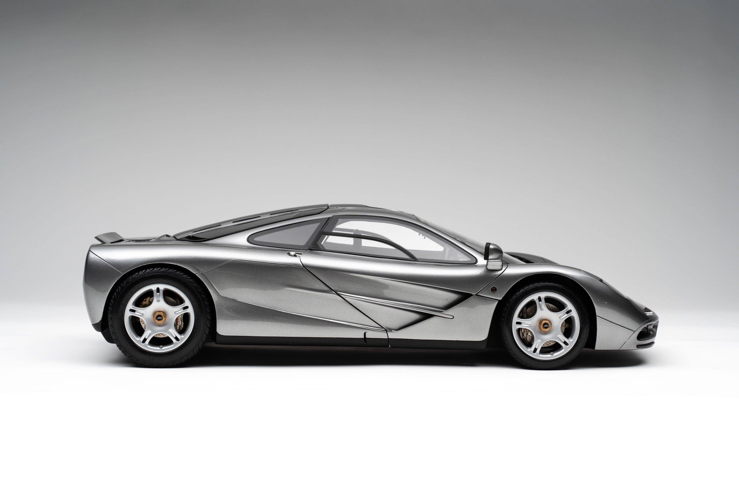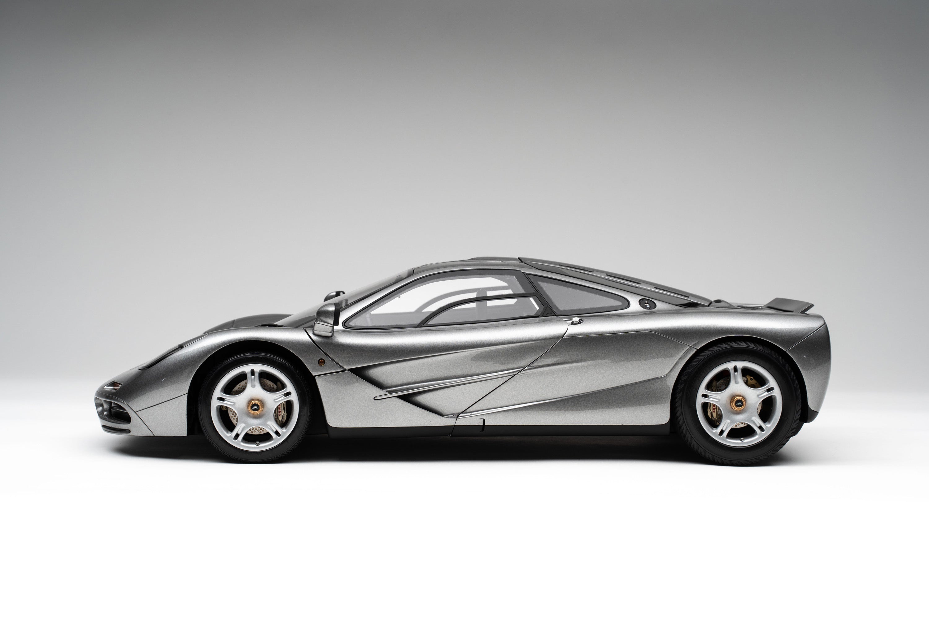 This fine 1:8 scale model of the McLaren F1 is available in dark metallic green or finished in silver, complete with a black interior, as first unveiled to the world at The Sporting Club in Monaco in May 1992, during the Monaco Grand Prix. It has been handcrafted and assembled in our workshops using detailed colour and material specifications supplied directly from McLaren Automotive, and our own CAD data created through digital scanning of an original car. Furthermore, it has undergone detailed scrutiny by both engineering and design teams to ensure complete accuracy of representation. Every Amalgam 1:8 scale model is supplied in a luxury black presentation box and mounted on a carbon fibre or leather base protected by a clear acrylic dust cover. The model title, original branding and edition number are displayed on polished stainless-steel plaques mounted at the front end of the base.
