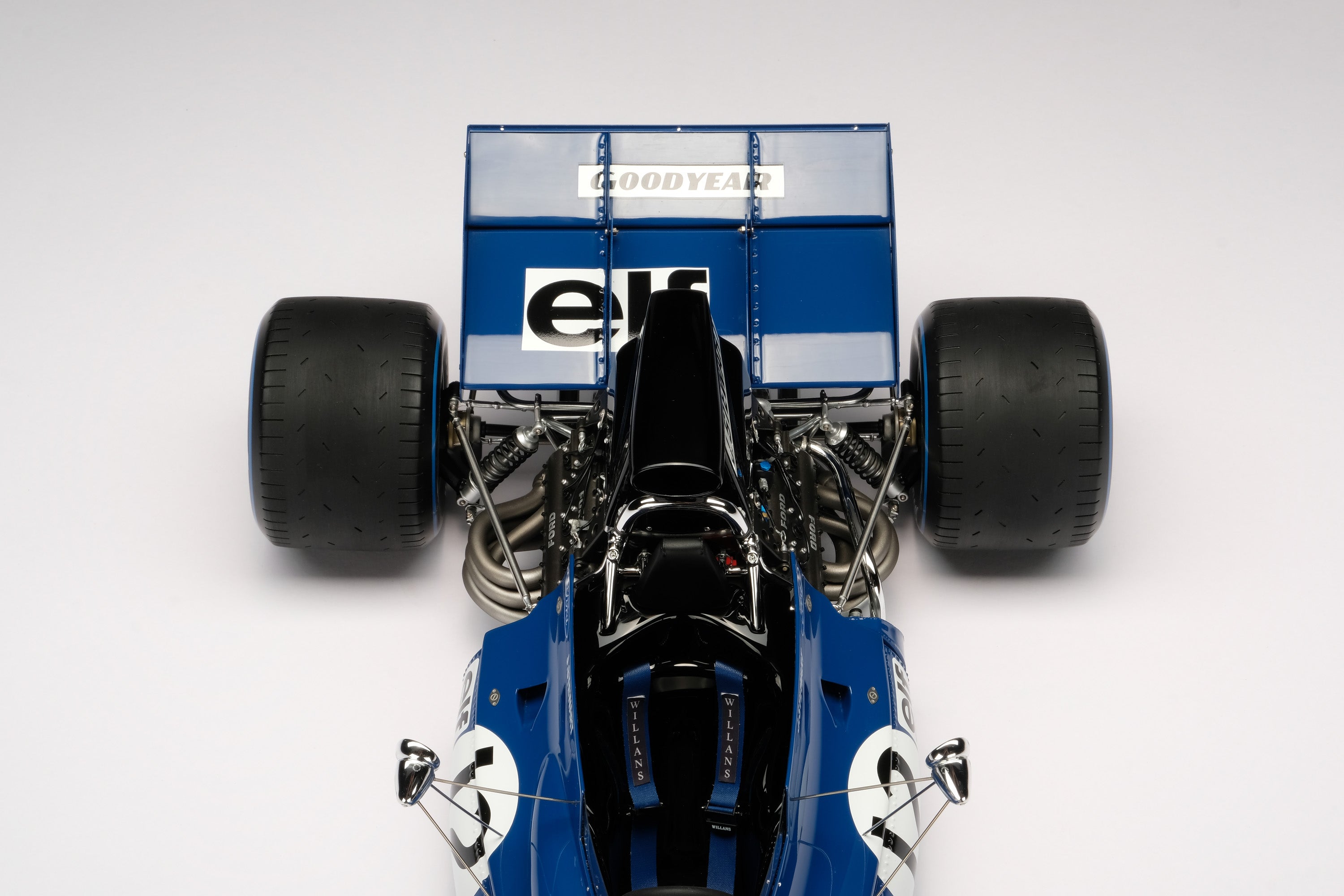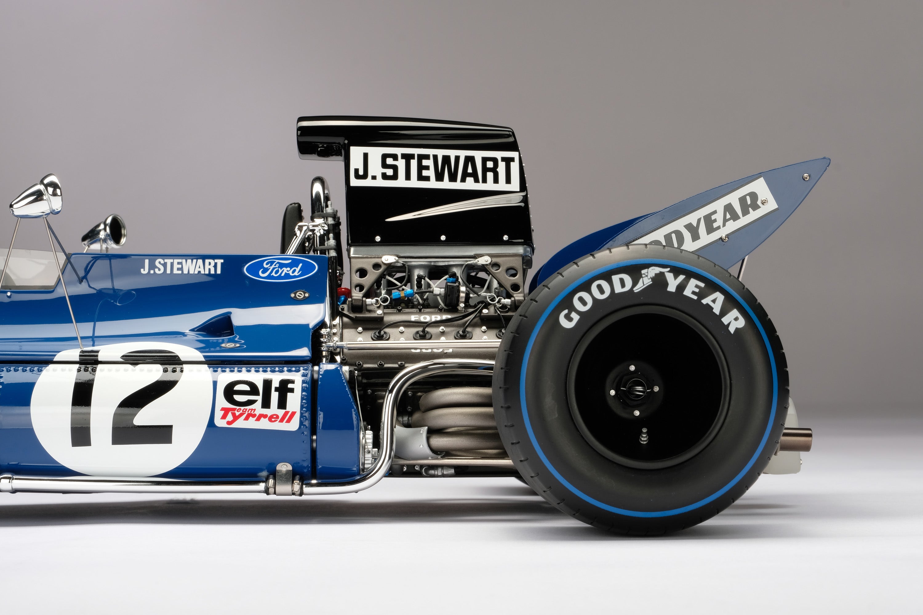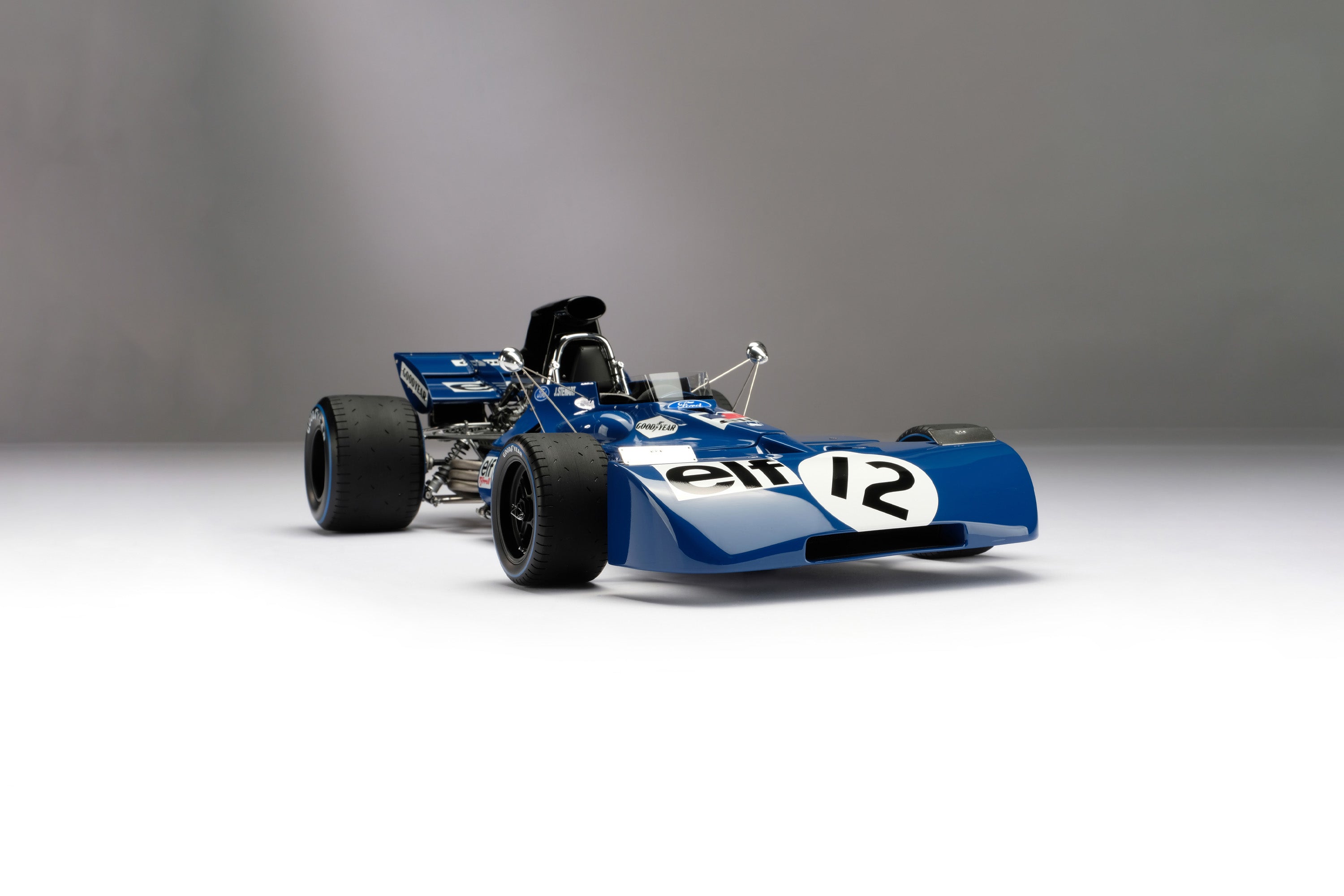 In the hands of Stewart, the 003 was dominant. Debuting at the second race of the season in Spain, the Scotsman qualified in fourth position and, after a close battle with Jacky Ickx of Scuderia Ferrari, went on to win. A remarkable achievement in only Tyrrell’s fifth race as a constructor. The next race at the Monaco Grand Prix saw Stewart starting in pole position and securing an even more domineering victory, despite the heat in the cockpit giving him nausea by the race’s end. There was a brief reality check in the Dutch Grand Prix at Zandvoort, as Stewart could only manage eleventh in treacherous conditions, but he would bounce back in style. From the Dutch Grand Prix onwards, both cars were fitted with a black air-box, forcing more air into the intakes of the Cosworth DFV engine, improving cooling and giving the team a straight-line speed advantage that no other could match. Stewart took full advantage, taking consecutive victories in France, Britain and Germany. A violent accident took Stewart out of the running in Austria, his left rear driveshaft breaking and tearing the wheel from the 003. Fortunately, both driver and chassis only suffered minor injuries. Such was his lead in the standings that Ickx’s retirement saw Stewart become World Champion without evening needing to finish the race. Three races remained in the season, but the newly crowned champion retired from the following Italian Grand Prix due to an engine failure. He followed this up with a victory in Canada, in what was the first case of a red flag in Formula1: the race was red flagged after 64 laps due to thick fog descending onto the circuit. In the season’s final race at Watkins Glen, Stewart struggled with tyre wear but acted as the ultimate team player, waving through his young teammate Cevert and holding his rivals up for another three laps. Cevert would go on to take his maiden victory, sealing a perfect season for the team. In the team’s first full season, Elf Team Tyrrell finished first in the World Constructors’ Championship, scoring more than twice as many points as their nearest rival.