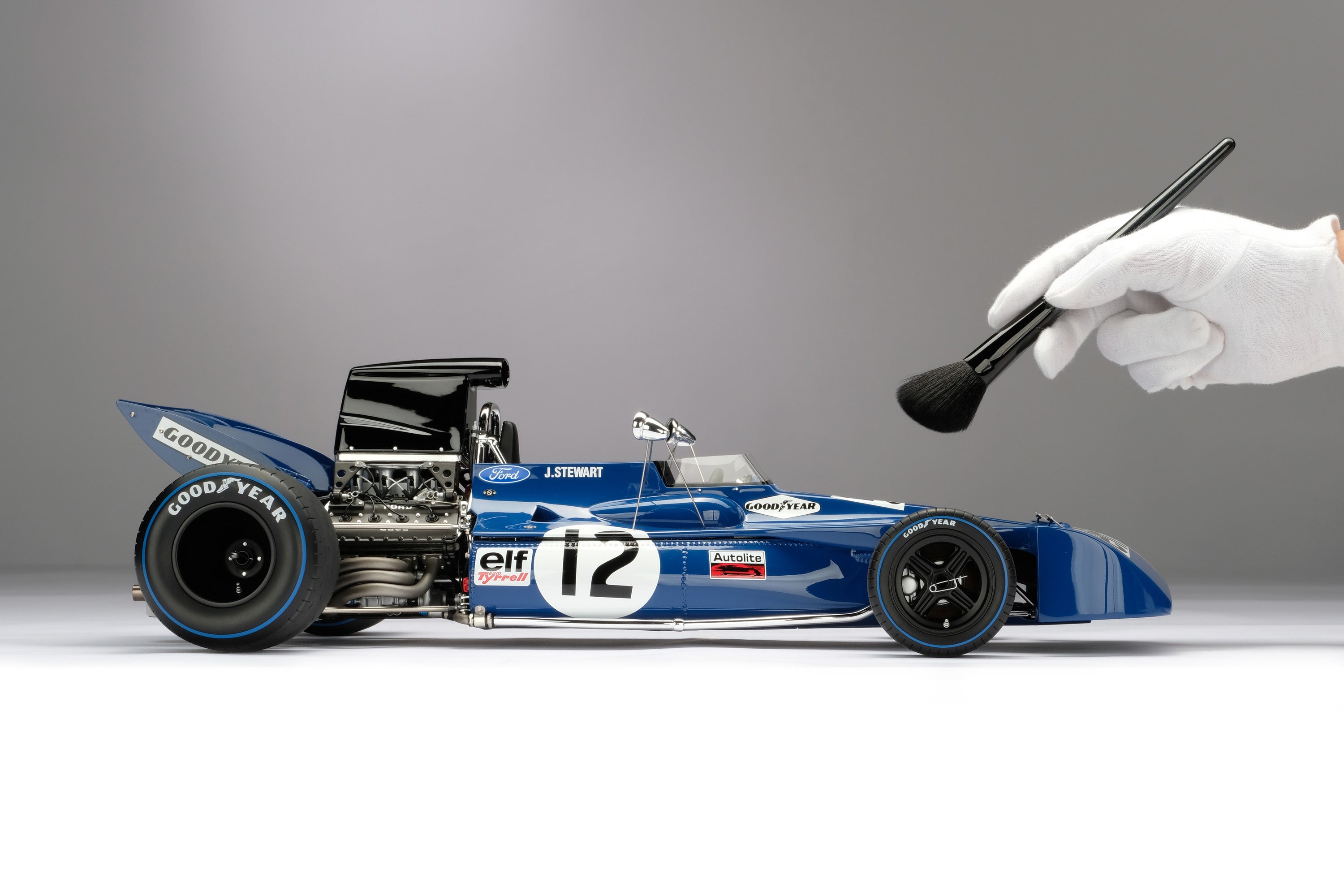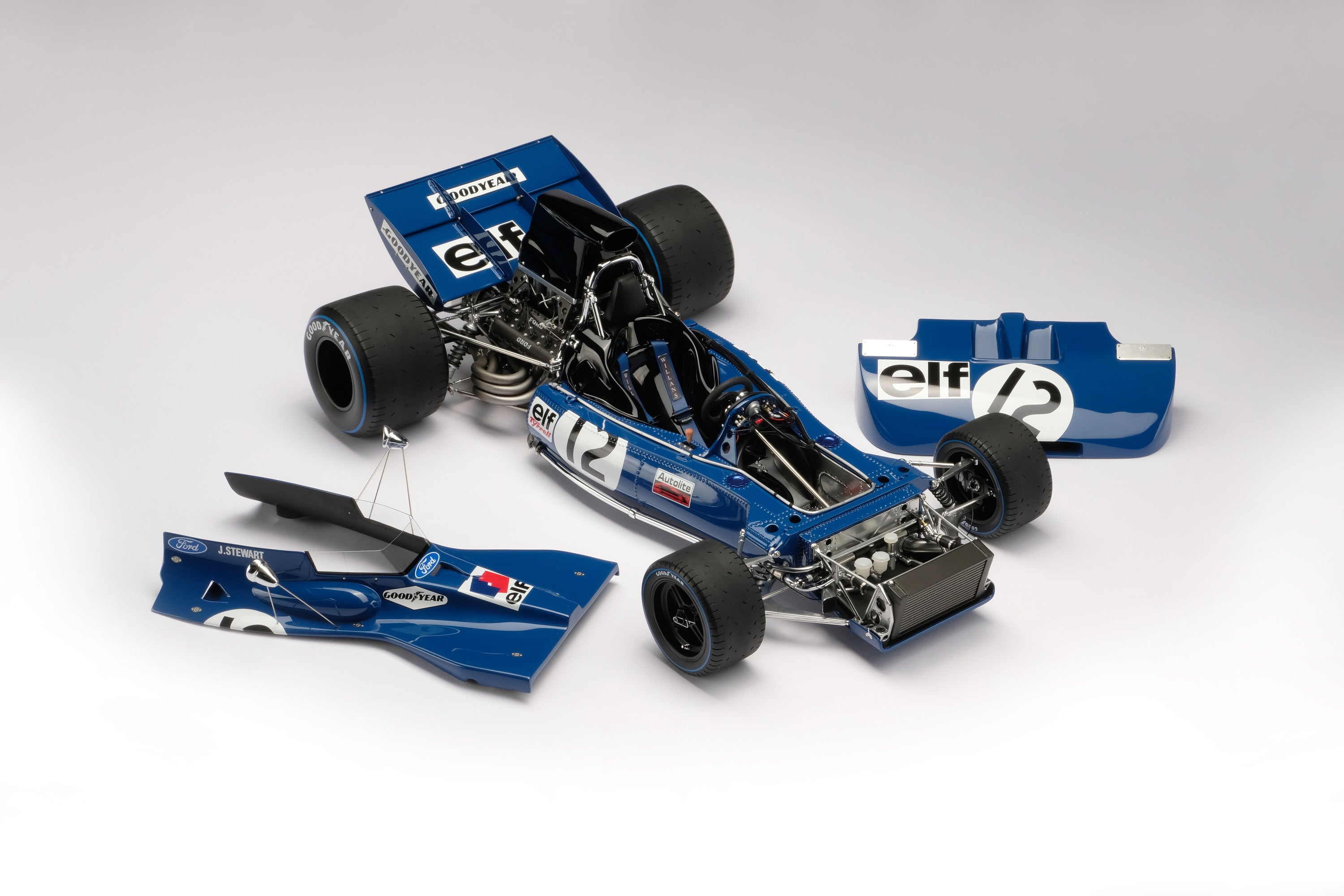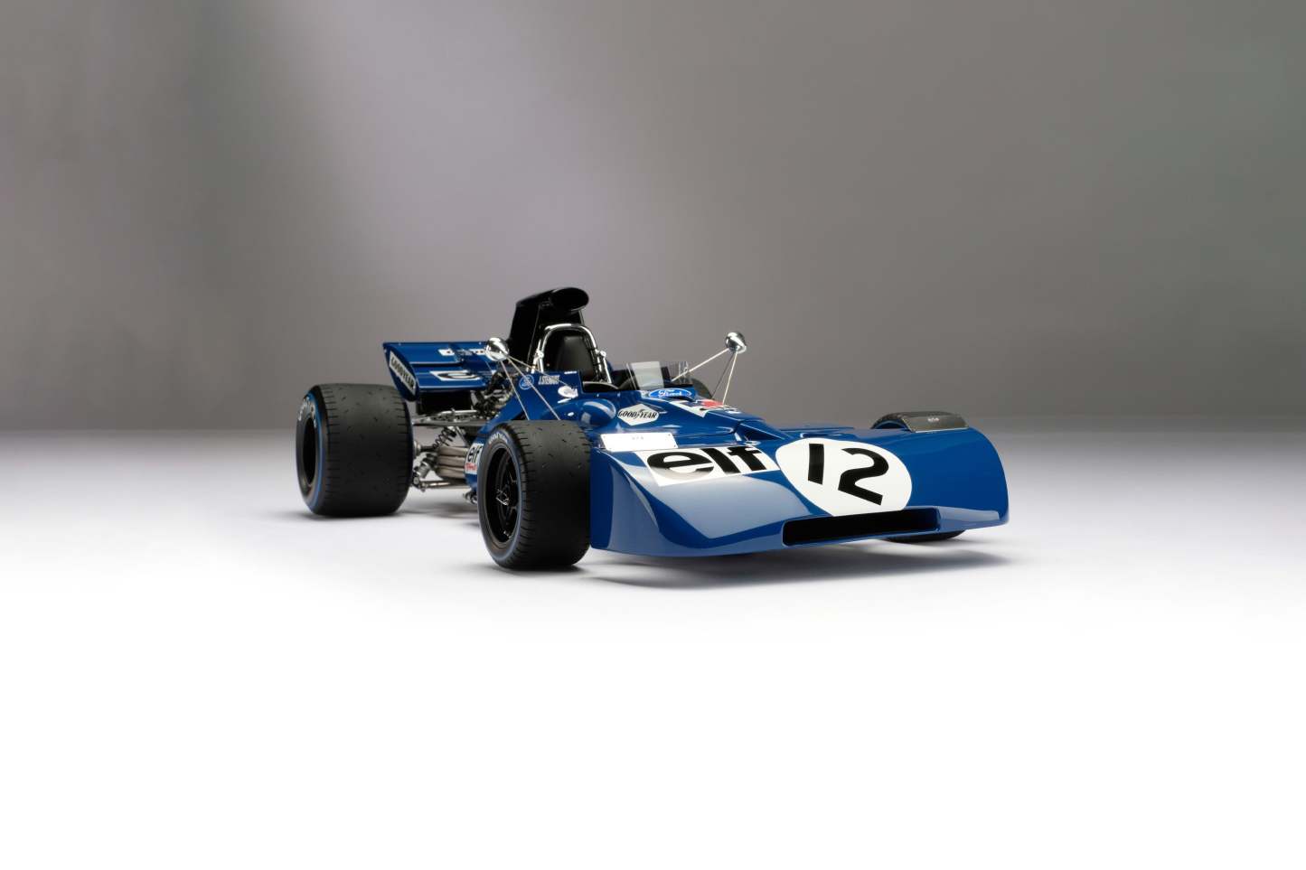 This fine 1:8 scale model of Tyrrell 003 replicates the car raced to victory by Jackie Stewart in the XXIV The Woolmark British Grand Prix at Silverstone Circuit on the 17th of July 1971. Stewart qualified second, behind the Ferrari of Clay Regazzoni and ahead of the BRM of Jo Siffert and the Lotus of Emerson Fittipaldi, the foursome separated by less than two hundredths of a second.