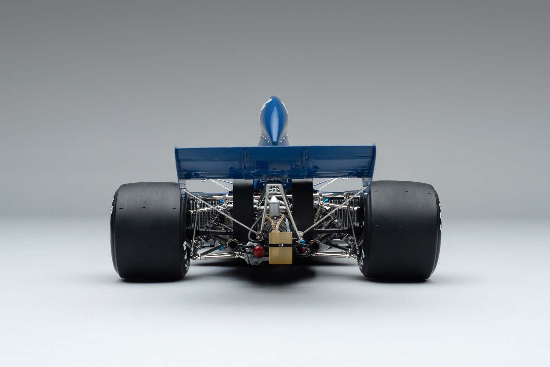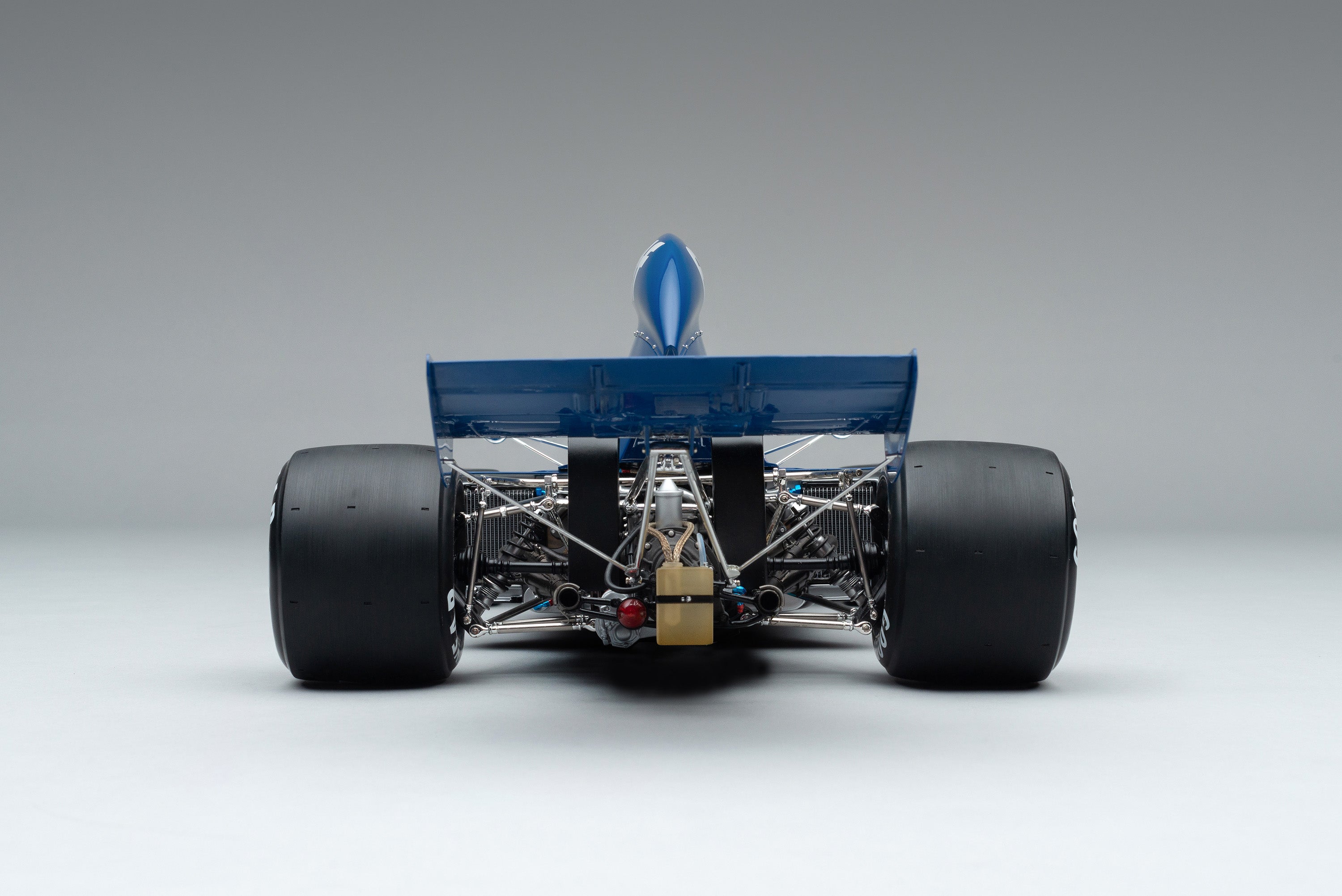 This fine 1:8 scale model is of Tyrrell chassis 006/2 has been replicated precisely as raced to victory by Jackie Stewart in the XXXV Großer Preis von Deutschland at the Nürburgring on the 5th of August 1973. A smooth and uninterrupted practice session for the Scotsman turned into the perfect qualifying on pole position, half a second ahead of Ronnie Peterson’s Lotus and a full second and a half ahead of his teammate François Cevert in third. A quick start by Cevert saw him alongside Stewart heading into the South Corner, allowing both Tyrrells to cut ahead of Peterson and push him back into third. By the end of the first lap, Peterson had retired with a major electrical fault, and Stewart and Cevert were already far ahead of the nearest competition of the McLaren of Jacky Ickx. The duo continued to cruise around in team formation, the two cars acting as perfect models of reliability and performance. After fourteen laps of the 14.19 miles (22.835 km) circuit, the Tyrrell racers reached the chequered flag and sealed the team’s third 1-2 finish of the season. It was Stewart's 27th and final Grand Prix victory, a record that would stand until it was surpassed by Alain Prost in 1987.